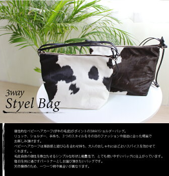 個性的なベビーヘアカーフ(仔牛の毛皮)がポイントの3WAYショルダ−バッグ。