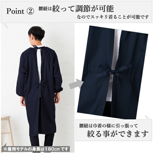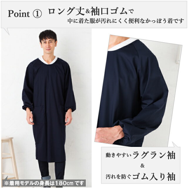 シンプルなデザインのロング丈の男性用のかっぽう着 袖口にはゴム入りで下に着た服が汚れにくい、また、ラグラン袖で動きやすく、 かっぽう着は、中に着た服が汚れにくいのでペットや、小さなお子様のいる家庭におすすめです。